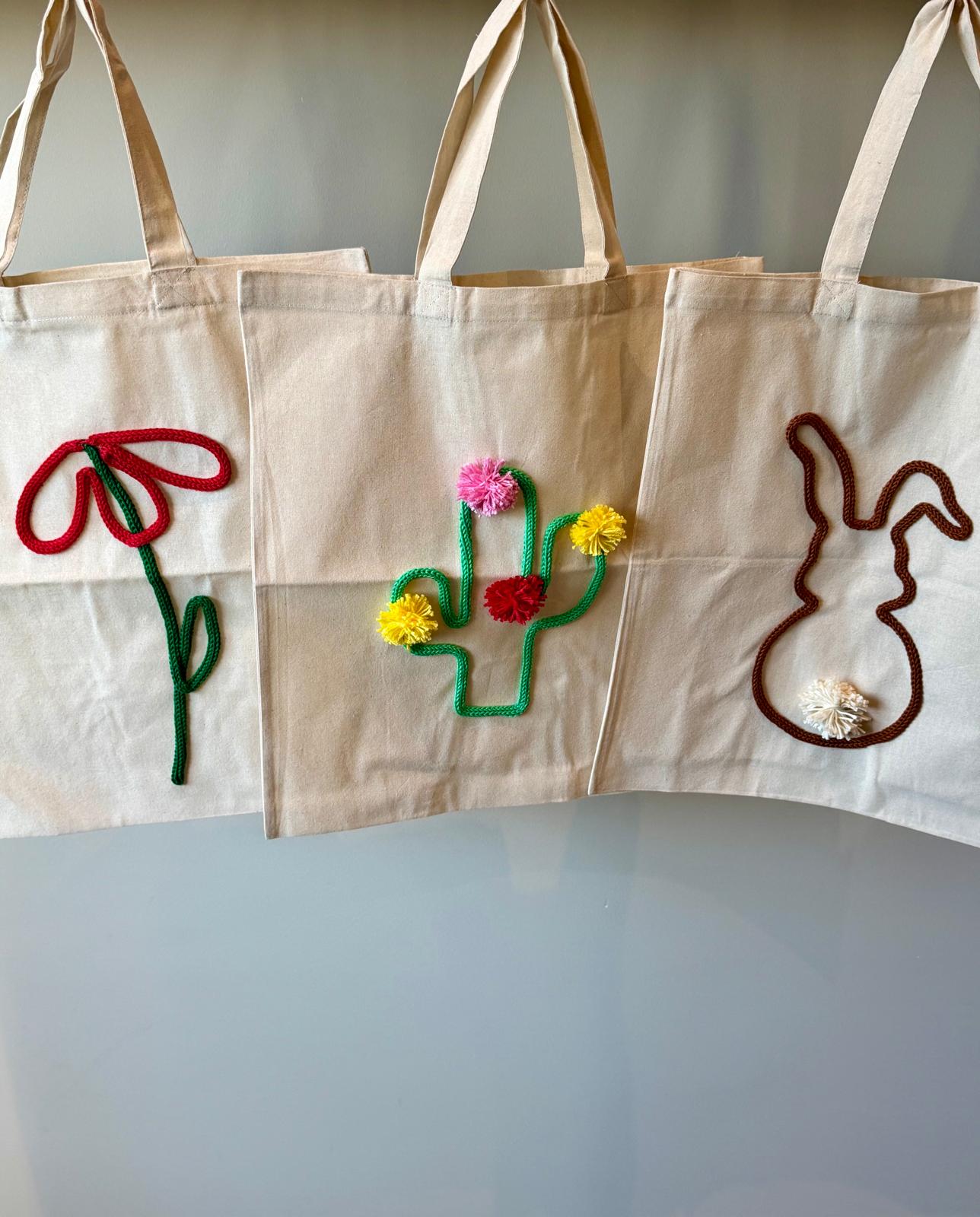 Zelfgemaakte tassen en knutsels, haakpakketten.